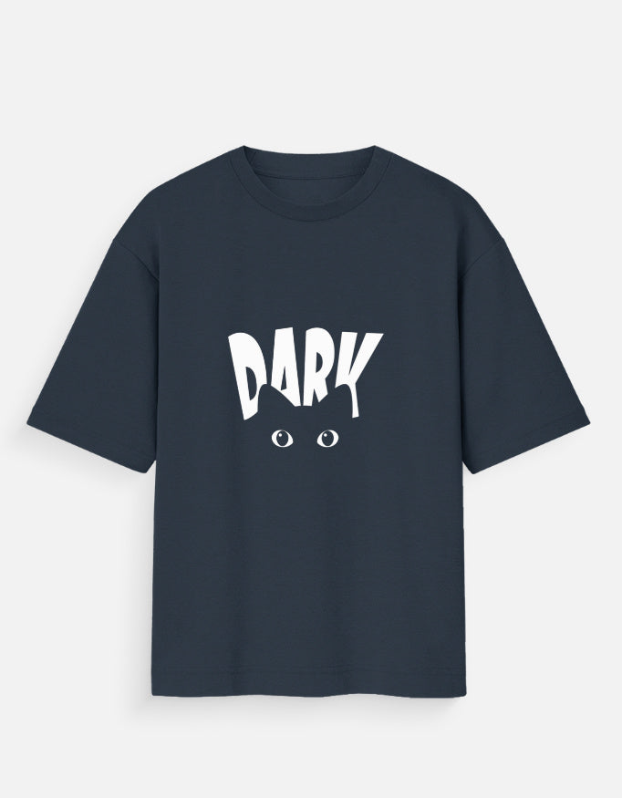 Step into the shadows in style with the DARK Cat Eyes Oversized Tee. This bold black t-shirt features a striking white "DARK" graphic, cleverly integrated with the silhouette of a cat and its mysterious eyes peeking through. Designed for comfort and attitude, the oversized fit offers a relaxed silhouette that pairs effortlessly with your streetwear staples. Whether you're embracing your inner night owl or just love clean, graphic design—this tee is your new go-to.