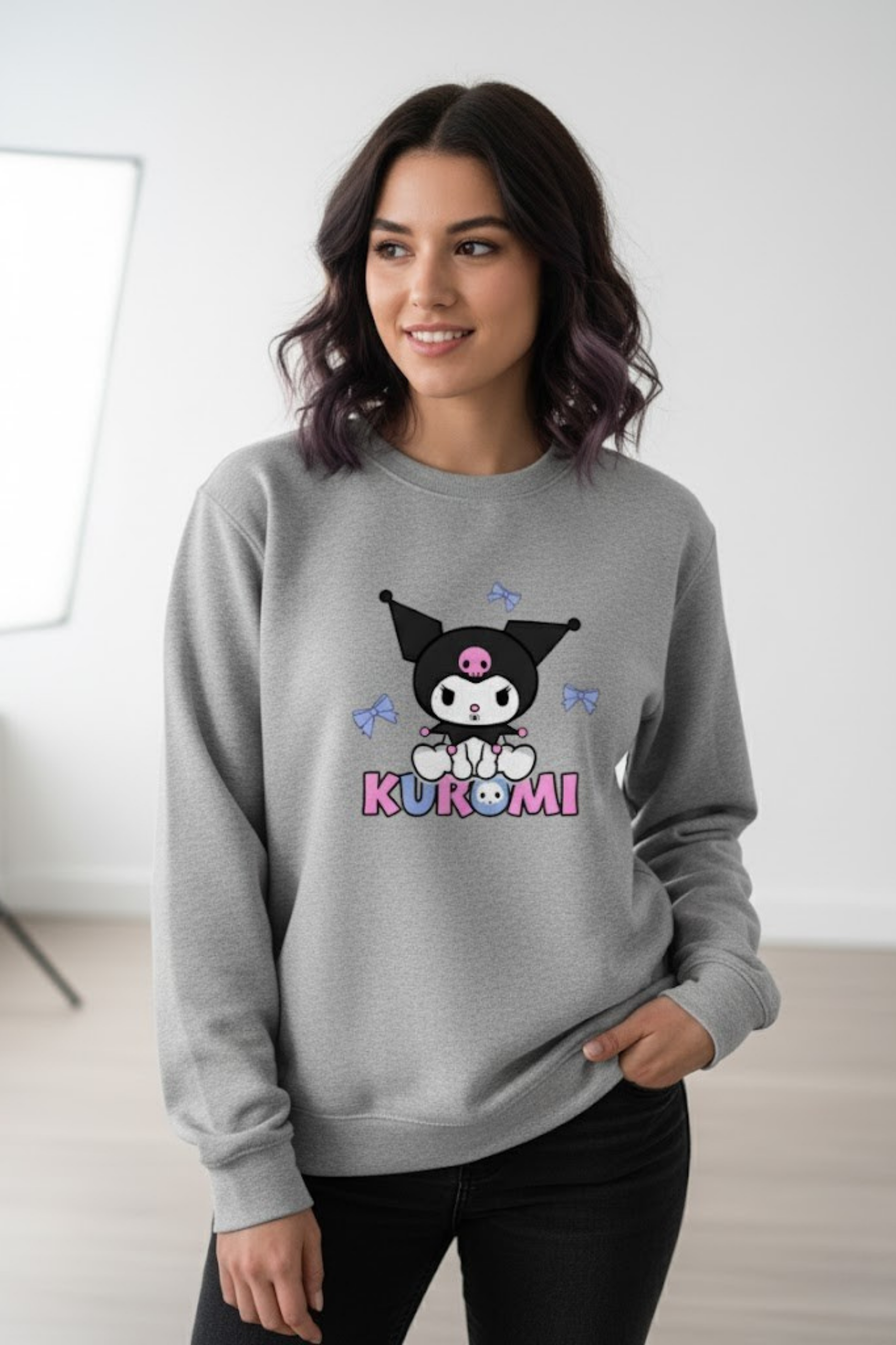 Embrace your mischievous side with this incredibly cozy Kuromi graphic sweatshirt! Featuring the beloved My Melody rival in an adorable, sitting pose, this design perfectly blends cute charm with a hint of rebellious edge. The graphic includes sweet pastel blue bows and the bold "KUROMI" text in pink and blue, making it a perfect statement piece. It’s ideal for Sanrio fans who love a touch of punk aesthetic in their loungewear. Made from soft, comfortable fabric, it’s guaranteed to become your go-to for casual outings or staying warm while binge-watching your favorite shows.