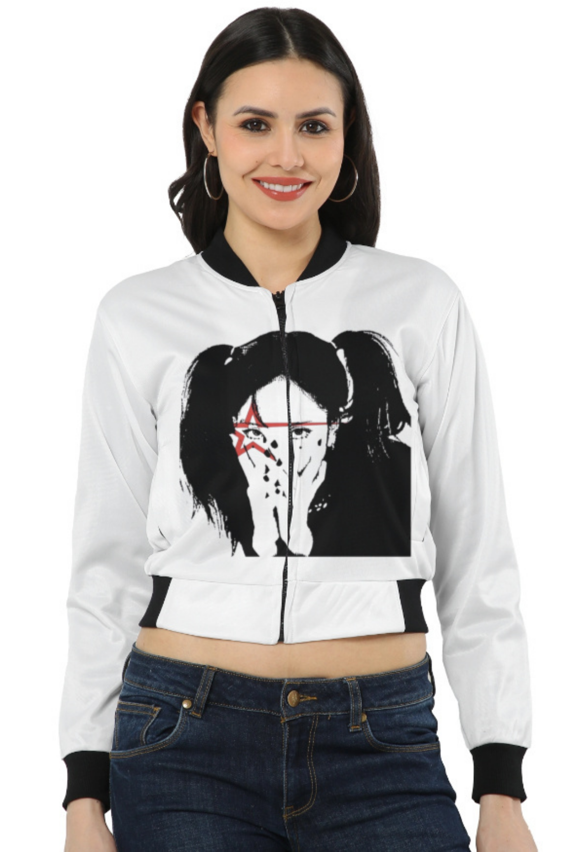 Own the night with the Red Starlet Bomber Jacket. This cropped piece features an arresting, high-contrast graphic of a figure with bold pigtails, their face partially concealed in a moment of punk-rock chaos. The stark black-and-white is punched up by a single red star over the eye, making this jacket a fierce statement piece. Made with a modern, cropped fit and classic bomber trim, it's perfect for layering over a simple tee or dress. Ideal for fans of pop-punk, dark academia, or alternative street style.